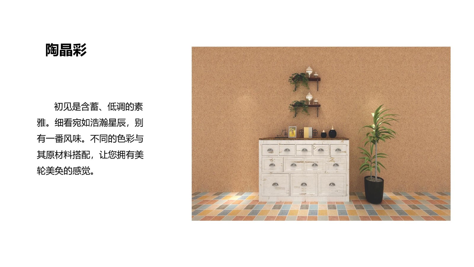 初見是含蓄、低調的素 雅。細看宛如浩瀚星辰,別 有一番風味。不同的色彩與 其原材料搭配,讓您擁有美 輪美奐的感覺