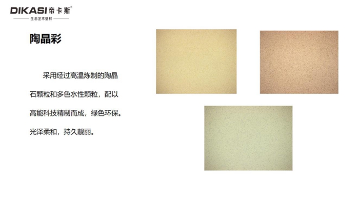 作為一款環保塗料產品,這款藝術漆采用經過高溫煉製的陶晶石顆粒和多色水性